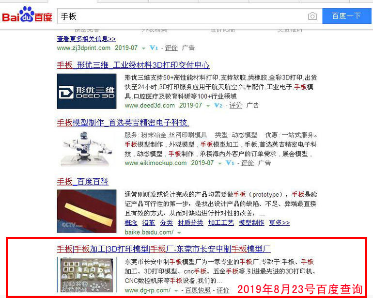 手板加工 : 2019-02-28上線    2019-03-05百度第20(原為第5頁(yè) 第7位)     2019-03-13百度第10名    2019-03-19百度第3名    2019-03-25百度第1名